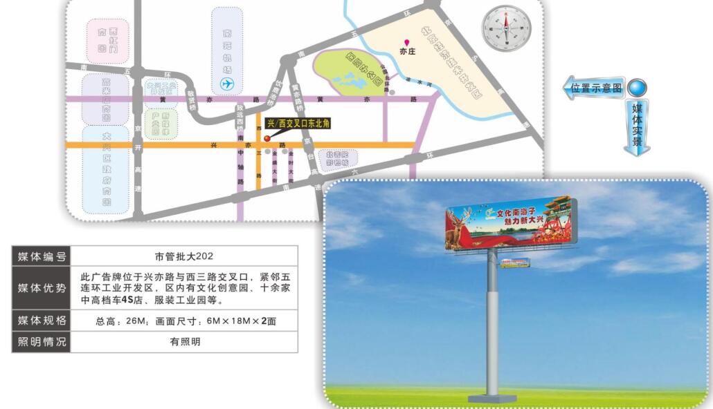| 亦莊雙面單立柱廣告 媒體位置:榮華北路、榮華南路、西環(huán)北路、東區(qū)科創(chuàng)五街 媒體規(guī)格:12m*4m*2面 |