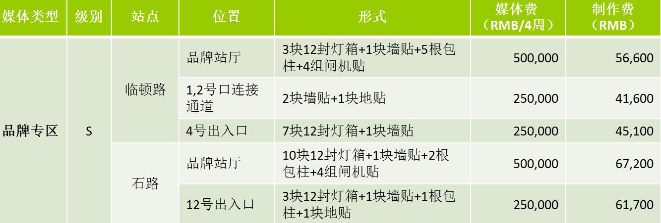 12封燈箱每塊950元,屏蔽門貼面積根據所選廣告發布位置的實際面積計算制作費