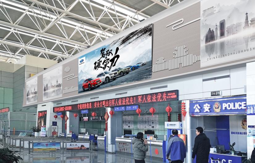 嘉峪關機場廣告??出發(fā)到達混合大廳辦票島上方led廣告