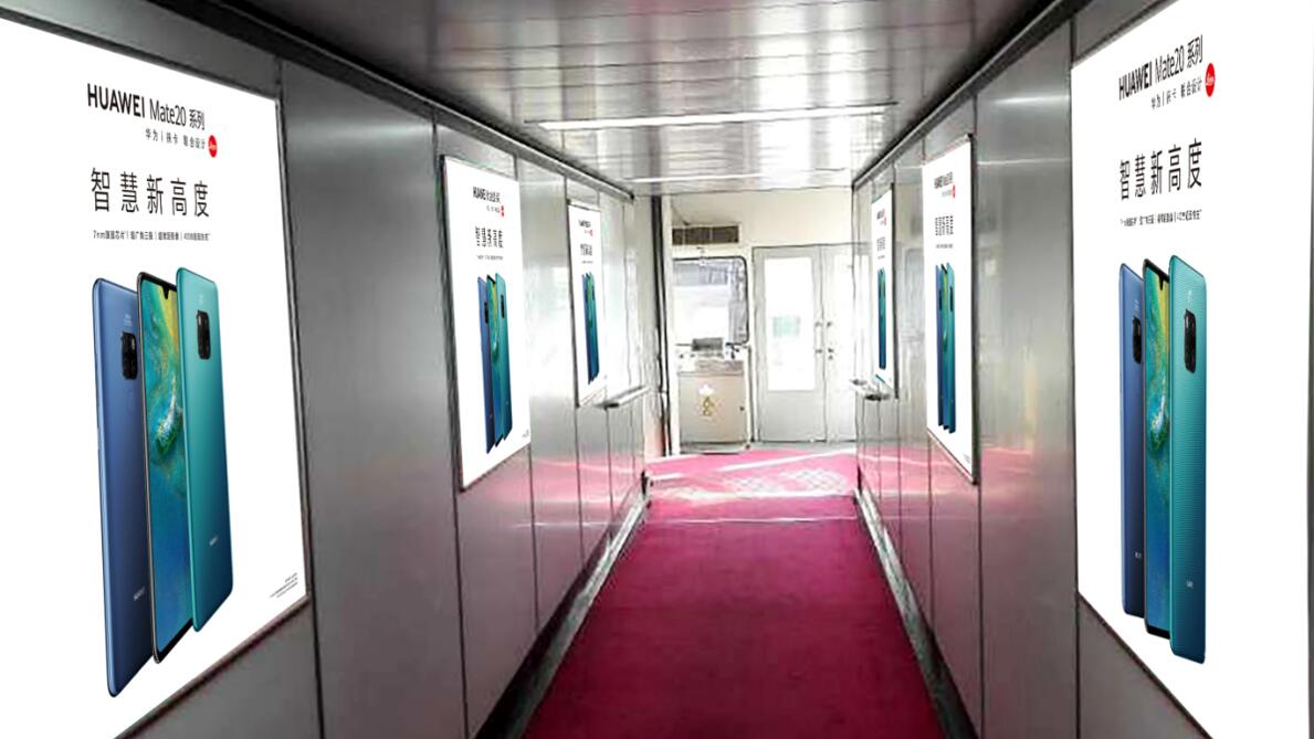 媒體位于T2航站樓9個廊橋移動段,100%覆蓋所有國內出發、到達旅客。