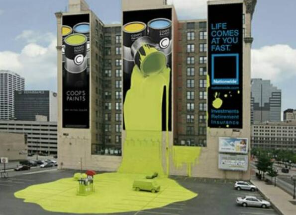 美國全國保險公司廣告采用的是戶外立體的大型廣告牌,從圖片中我們可以看出巨大的廣告牌里是不同顏色的油漆,有一桶油漆直接倒了下來,倒在地上,車上,到處都是。如此的廣告牌告訴我們,走在路上油漆桶都有可能倒下來,這種事情我們絕對提前預知不到,為了我們的生命安全,我們要多注意,更重要的是還是多買份保險,意外天天都有,災難隨時回來,買份保險才是真道理。