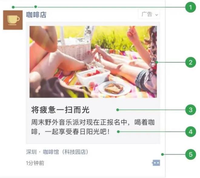 朋友圈圖文廣告由五或六個部分的內容構成,包含廣告主頭像&名稱、外層文案、外層圖片、文字鏈、用戶社交互動等, 本地推廣圖文廣告還包括門店標。