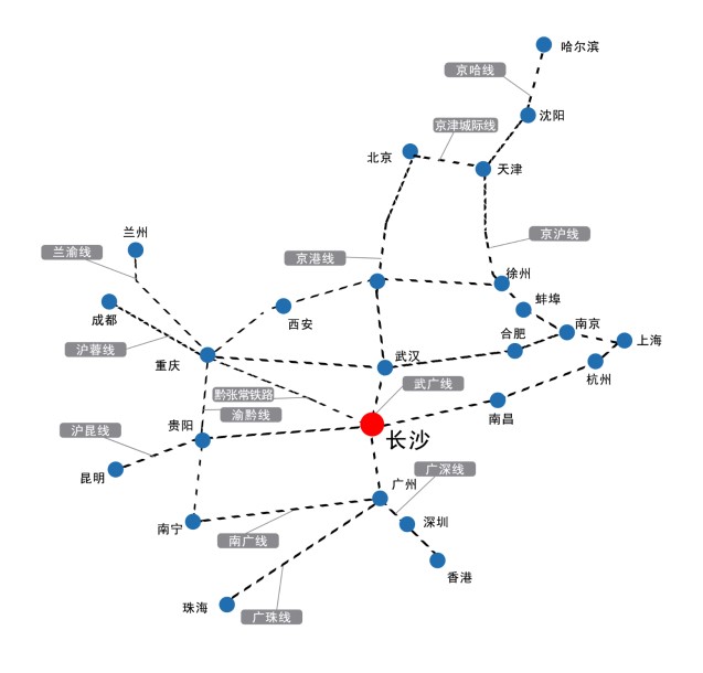 武廣高鐵,滬昆高鐵,建設中的渝長廈高鐵,讓長沙成為世界上唯一有多條高鐵交匯的城市。武廣、滬昆兩條高鐵大動脈在此交匯,使得長沙成為中部最大的全國性高鐵樞紐城市,也被稱作為“離世界最近的地方”。