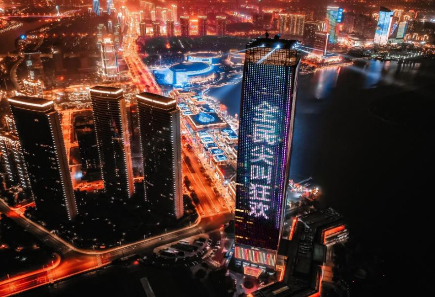 無敵景觀-太湖第一高樓;360度環繞瞰盛宴;231 米 高;1 0 萬 方;日均人流 1 0 0 萬;環太湖中心;萬顆星光點亮天幕;5 A 甲 級 環 幕全 景呈 現