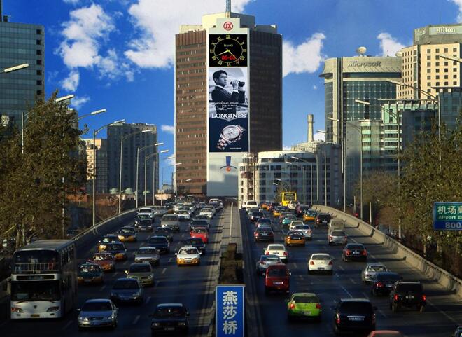 而如果從東三環去往首都機場,則更是必定長時間注意到該LED屏。對于來京、出京從事商務活動的人士來說,巨大的、占據了整個樓體的該LED屏,極佳的亮度和觀看視野,都注定會長時間留在人們的印象中,成為他們關于北京的城市記憶中重要的印跡。