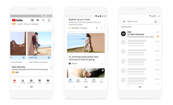 Discovery Ads將會在YouTube主頁、“Watch Next”、谷歌搜索APP中的“Discovery”以及Gmail推廣和社交的Tab中展示,有多圖輪播廣告和單圖廣告兩種形式。三個平臺覆蓋了29億用戶。